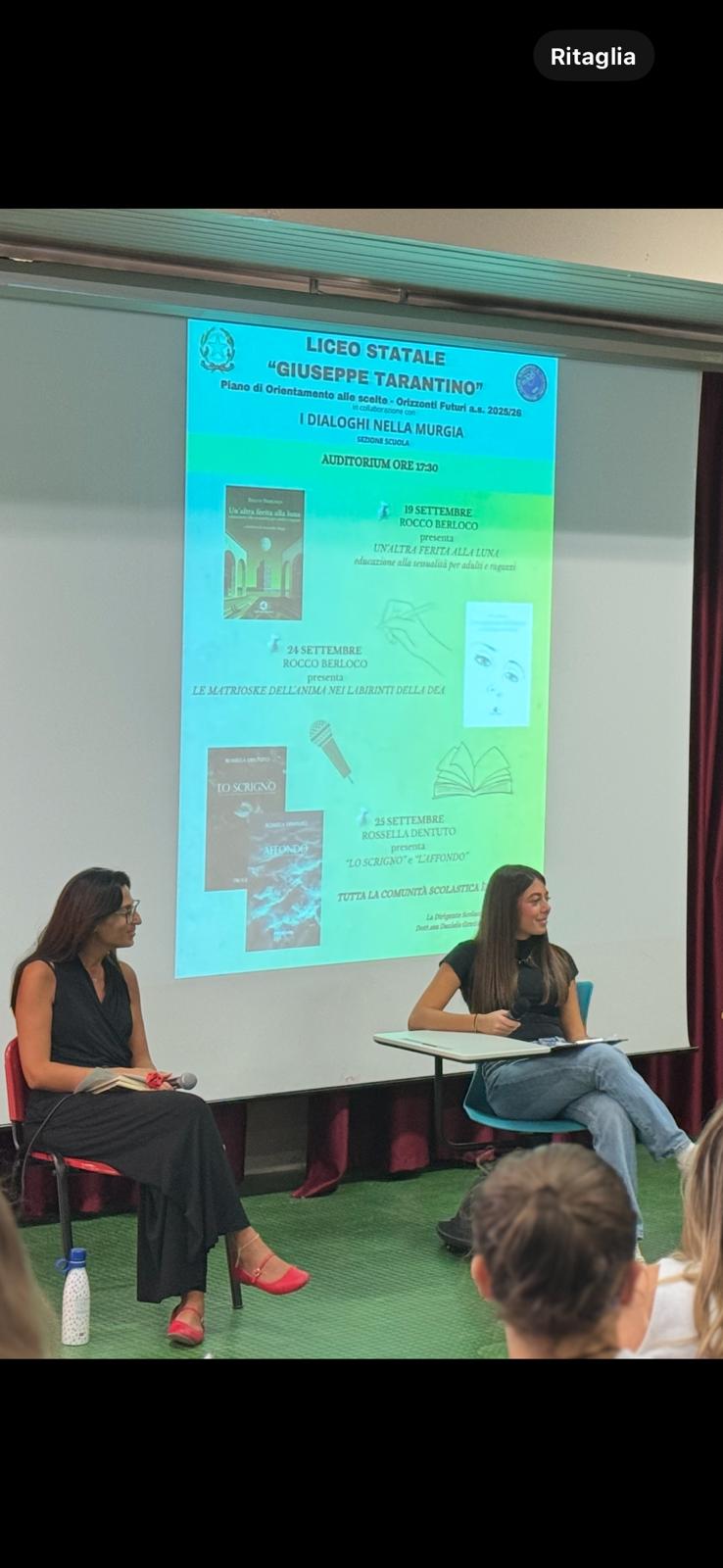 Il Liceo Tarantino ospita per i Dialoghi nella Murgia -sezione scuole l’autrice, dott.ssa Rossella Dentuto, con i suoi racconti “Lo scrigno” e “L’affondo”, storie di donne che attraversano la sofferenza per ritrovare se stesse, un inno alla lentezza, un viaggio verso la rinascita, libri che ci parlano della necessità di fermarci, respirare, ascoltare le proprie stagioni interiori, nella consapevolezza che ognuno attraversa il proprio inverno…e che prima o poi, se siamo abbastanza coraggiosi da restare, arriva sempre la primavera.