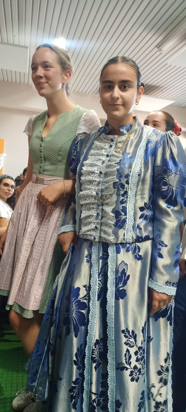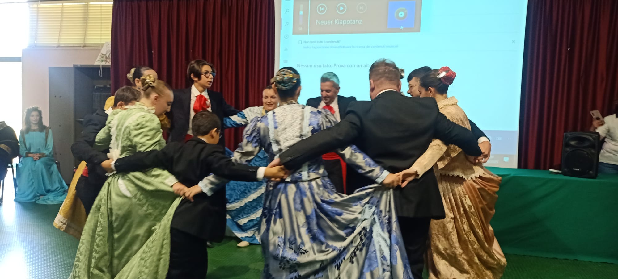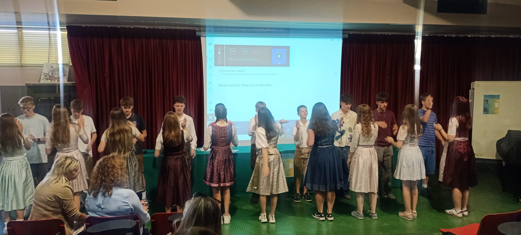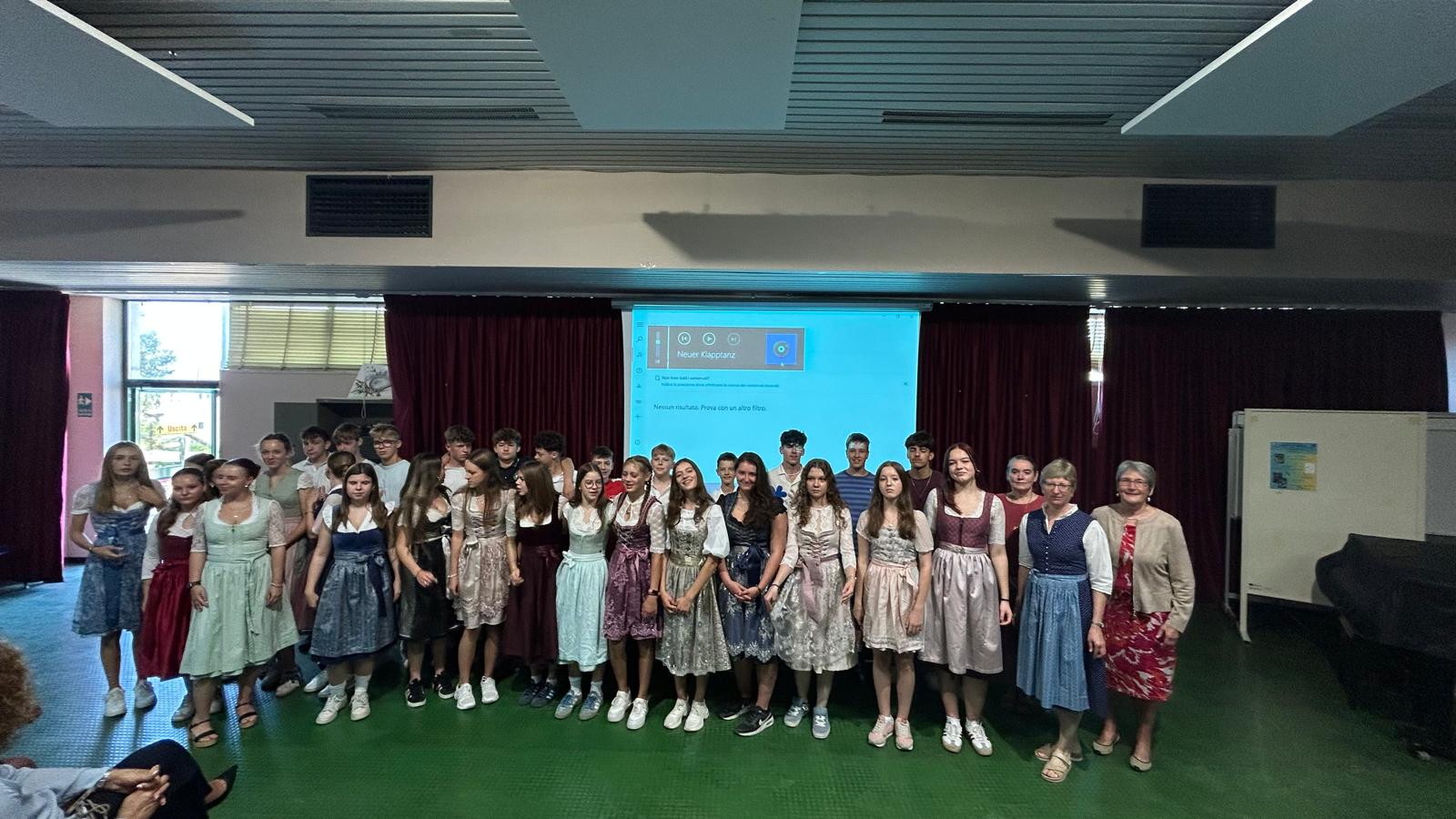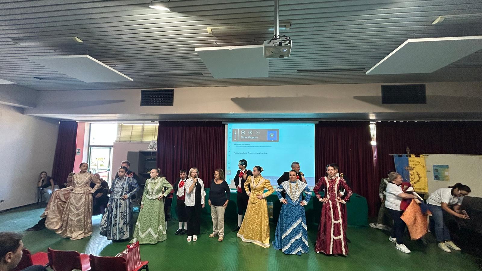 Bel connubio tra studenti tedeschi e italiani nei balli popolari, con costumi tradizionali.